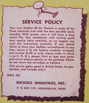 box. One of the nicest things about Nichols Industries Cap Guns was that, besides being the best quality in the first place (am I biased?), you could send them in to get them fixed. These days it's hard to get any company to help you at all!!! |