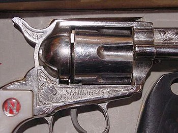to get much closer than this shot. I have focused a little "hard" perhaps to get the chrome to stand out, but the cylinder on the MK-II is quite nice and shiny. After looking at the Stallion 45 MK-II it is easy to understand why it has been called the "King Of The Cap Guns!" Many thanks to Ken Rigler for these photos. |