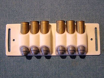 bullets. They are the same zinc alloy as the guns, but aren't plated. They are 2-piece. Put a cap inside, load the gun, and you're ready. There is a hole in each end of the bullet so that when the gun is fired, the smoke from the cap goes through the bullet and out the end of the barrel of the gun. Very realistic! Thanks to Robert Nichols for the photo contribution! |