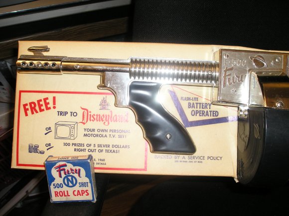 now for what this set would cost you! With a new set of batteries and a good gulp of air you could shoot 500 caps in a hurry with this baby. And then that sweet smell of gunpowder and sulfur. That is, if you could resist the urge to pound the whole roll of caps with a big hammer like I did. Very nice photo thanks to John Guffey |