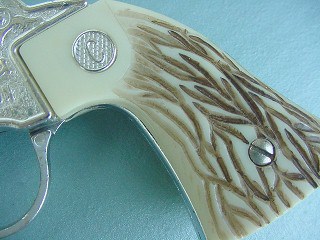 Gun. Beautiful staghorn grips, huh? And look at that Circle "C." It looks as if it just came out of the molding machine. But I don't think that Carnell Cap Guns are common enough or popular enough that any 3rd party people are making the grips for them. As previously stated, this is one rare Cap Gun and in great shape! Photo thanks to Doug Hamilton |