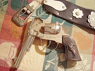 that some young Buckaroo can fill it with ammo. (caps for you tenderfeet!) Besides Trigger on the grip, (Roy is also there) you can see the Double R Bar Brand on the upper portion. It's also present on the buckle of the holster. Photo thanks to Michael Sheehan |