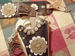 is fine (which this one REALLY IS!), then it is okay. On the pocket of this holster you can see the concho with the fancy insignia that we are going to see quite well in the next frame. Notice that we have some fringe on the holster as well. Photo thanks to Michael Sheehan |