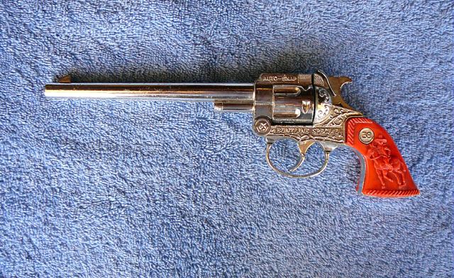 Here is the left side of this rather long Cap Gun. Notice that it says, "AUTO-SNAP" above the cylinder and "38" on the grips. Seems like Wyatt Earp would have had a .45 to me.