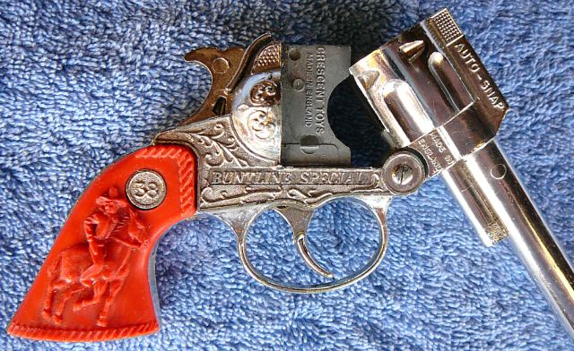 In this shot, you can easily read, "CRESCENT TOYS MADE IN ENGLAND" inside the cylinder area. We also get a good close up of the cowboy on his cayuse. That's "HORSE" for you city slickers.