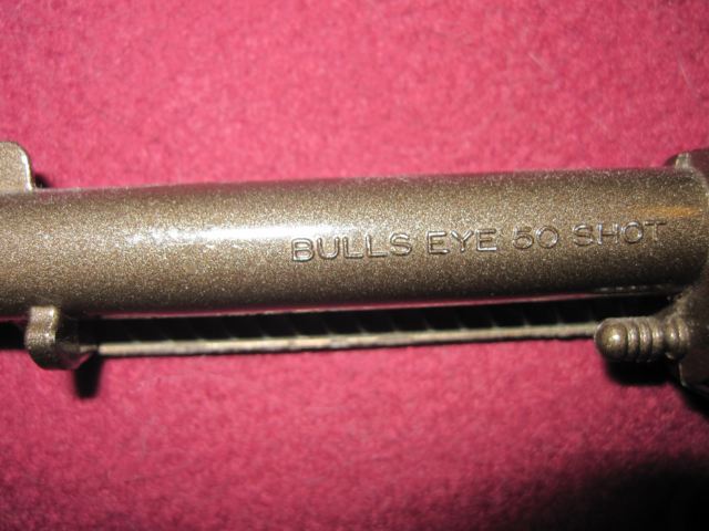 Now we can easily read the "BULLS EYE 50 SHOT" on the barrel. This gun has a, sort of, bronze, look to it.