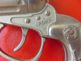 together, so these screws are fake. You can read "PONY" on the side. Most of the collectible guns at least had their names on the side and most also had the name of the company that made them. And sometimes the city where they were made. Nichols Cap Guns had them all. Photo thanks to Doug Hamilton |
