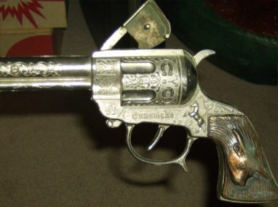 This photo shows the pop-up roll cap holder, which is unusual in Cap Guns. It's pretty easy to read, "GUNSMOKE" in this photo.