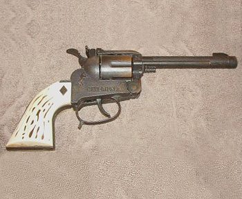 manufactured by Leslie-Henry for HALCO. If you will strain your eyes, you can just barely read the "45" just to the right of the "MAVERICK." This gun also has the standard diamond "H." The rear part of this frame is "kinda square" I think. Not very streamlined. Photo by Ed Myers |
