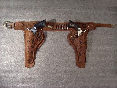 | Now this is a nice set. These days you just don't see much in the way of nice tooled leatherunless you are buying from one of the private artisans. In the old days it was quite common to see good quality. I have purposefully made this pop-up a lot larger in order to let you better see the leatherwork. Photo thanks to Rich Hall |