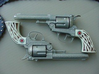And he delivers. Here is virtually the same Cap Gun by Hubley, but the Colt 38 version. This is the RARE dull nickel finish model. Photo thanks to Doug Hamilton |