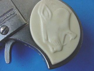This is the best view you will ever get of the grip on this Cap Gun. Taking photos of white grips is tricky to say the least. MINT.