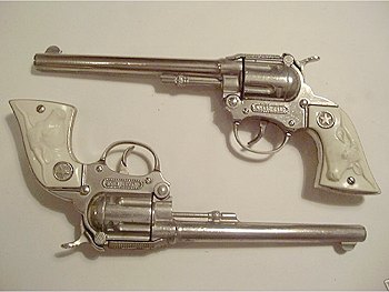 | The same guns, but in the left-handed view. Just look at the grips and plating on these babies! It's common for me to airbrush some of my examples, as I am trying to give you, the viewer, an idea of what the Cap Guns were supposed to look like (if possible) when they were new. However, these are so good that I haven't touched them. Photo thanks to Rich Hall |