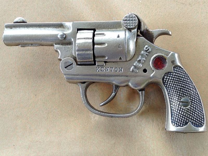 measures 5- 3/4" and uses roll caps. It has a cylinder that revolves. The gun