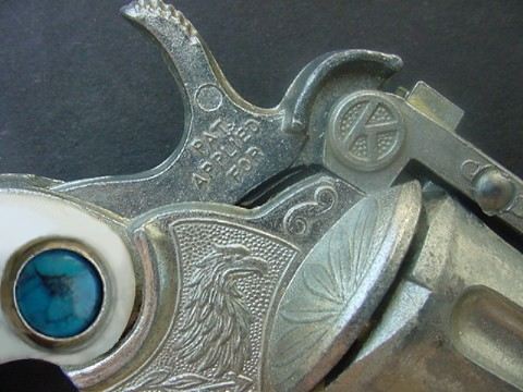 Here it is easy to read the Circle "K" which was a common feature on most of the Kilgore guns. Nice scrollwork on the eagle behind the cylinder.