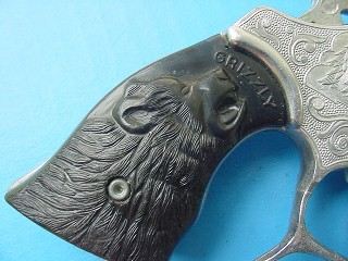 More proof that the grips were riveted on. Though this photo is very slightly overexposed, you just about have to in order to show the grain of the bear in the grip. Ursus Horribilis.