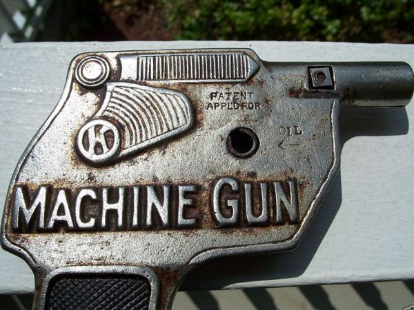 Here's a closer view of the hole where the crank goes that you turn to make it fire like a machine gun. Alas, the crank is missing. Send one quick!