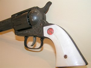 associated with Stallion 45s. There is a hairline crack from the Circle "N" down to the screw that held the grip on. The standard opinion is that the brittleness of the white grips and overtightening of the screw was the problem. However, most Stallion 45s came with an extra set of grips. Photo thanks to Jamie Linford |
