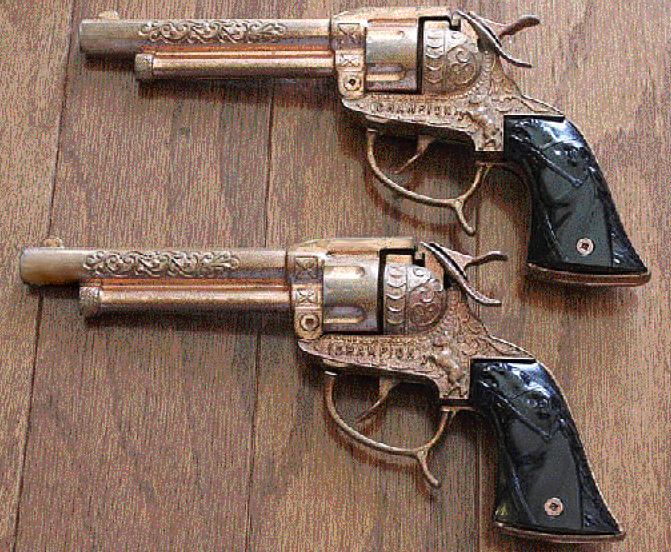 And here is the left side of these nearly priceless Cap Guns, showing the characteristic square-hold screws that you usually see in Canadian Cap Guns.