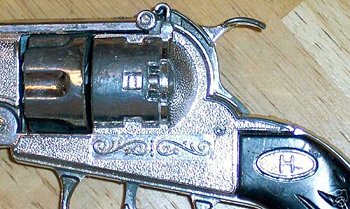 | Same same, left side. This Cap Gun is hinged right in front of the cylinder and "breaks down" to allow for caps. It is interesting that in our current "miasma" of political correctness, toy gun caps are considered "explosives." Therefore, the government considers them "dangerous," and you can't ship them in the U.S. Mail. More stupidity from our governmental experts. |