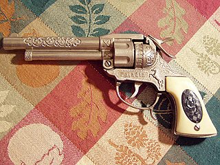 | More quilt. It's easy to read the "Paladin." I think it is unusual also that the word, "Paladin" is composed of both upper and lowercase letters. Usually a name is only uppercase. Picky, picky! SPECIAL BULLETIN!!! I've just been informed tha there are interlocking horseshoes on the Paladin grips. Thank you very much! Photo thanks to Michael Sheehan |