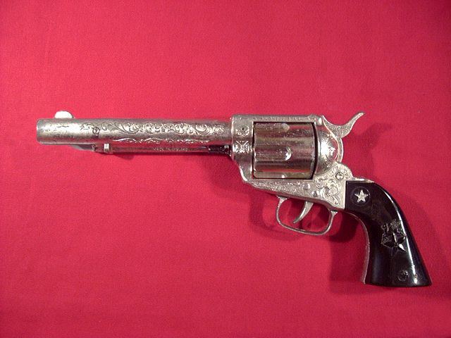 The left side. I don't really know if it also has 2-piece bullets like the Nichols original. Collectors of real guns will notice that it has the earlier frame that doesn't have the little stud you pull out to facilitate taking out the cylinder. This cap gun also has rivets-not screws like the fancier Nichols version.