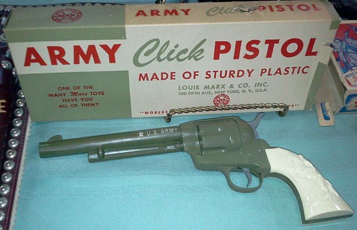 This must be one of the rarest boxes. Marx probably produced more toys than anybody. This click single action Army (Peacemaker) seems to be in pristine condition.