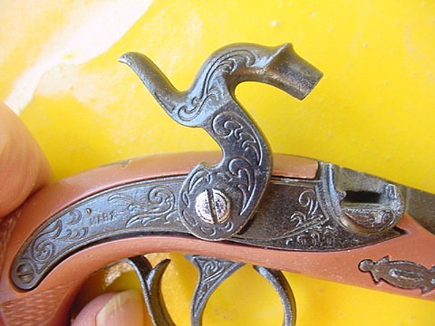 Here's a close-up of the action of this little toy. It didn't have a flash pan cover like the Nichols version, which also would hold the cap in place.