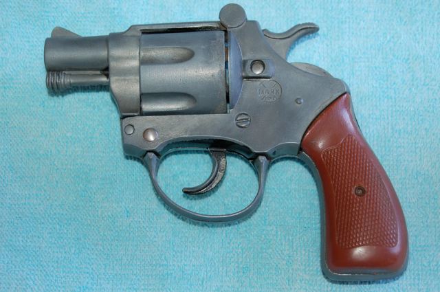 Where the cylinder release is normally positioned on a real Smith & Wesson is where I think the release is to break this gun down. Here you can also see the Marx logo.