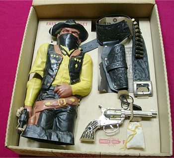 the black hat!) You can get an idea of the huge size of this set by comparing the Bad Guy to the size of the Shootin' Shell Cap Gun. Nice holster set and other stuff too! Photo thanks to Ken Thompson |