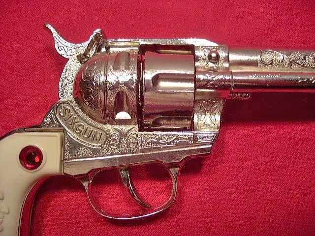 Here we can easily read the inscription for the name of the Cap Gun. I made "SIX GUN" two words, but perhaps it is only one. Or they ran out of space.