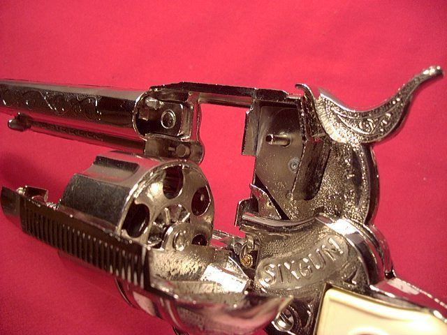 Here, with the cylinder on the downswing, you can see that there is the standard stud for the roll of caps and room for the dummy bullets.