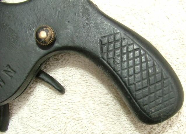 Here's the left side of the grip, showing what appears to be a brass screw. It could also be that pulling on the wheel did two things: Fire the gun and advance the caps. You tell me.