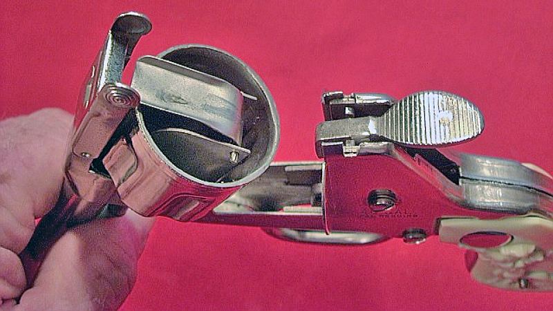 This is one of the rarer Cap Guns in the hobby. And this shows the inside of the gun. I think you lower that plate and put the roll of caps behind it.