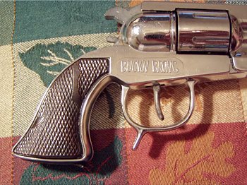 can very easily read the words, "BUCK'N BRONC." Just like the similar Davy Crockett model, this one was made from the same tooling, just with a different name. Notice the VERY shiny chrome on this gun. Remember that the cylinder turns also! Photo thanks to Michael Sheehan |