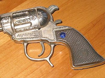 put red jewels in the grips. This Cap Gun uses roll caps. My Uncle Talley did some nice work on improving the quality and speed of the manufacturing of roll caps in order to help his own profit margins. And so it helped all of the Cap Gun companies. Photo thanks to Deb Bamesberger |