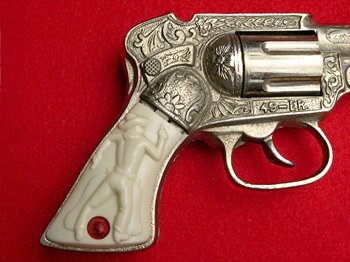 who is wearing chaps and has a gun in each hand. This gun almost seems like a cross between a pistol from a Spanish Conquistador and a Colt 45. Very shiny with the gold finish. Photos thanks to Ed Manes! |