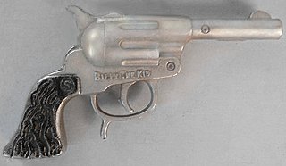 changed it a little. The "BILLY THE KID" signature is quite evident and you can barely see the Circle "S" (for Stevens) on the grip. This gun was riveted together. This was one of the last cast iron guns made around 1950 and the grips were painted black. Photo thanks to Vic Wawiorka, Jr. |
