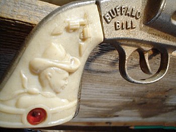 and frame area. Notice the detail on the grip and the crossed guns, the cowboy (complete with bandanna) and the genuine ruby jewel! Again, we can see that it says, "MADE IN USA." Photos thanks to Country Junque Shop |