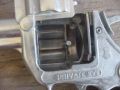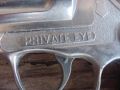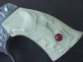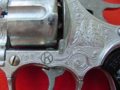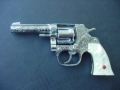 action detective-style pistol with a nickel finish. It has flip-back checkered
