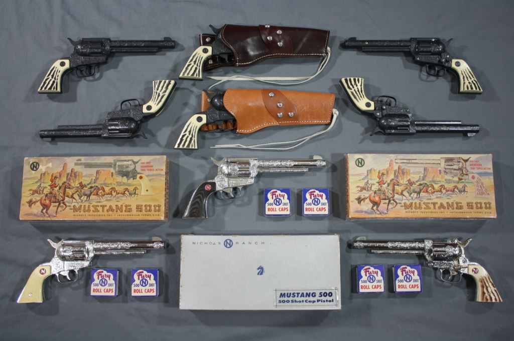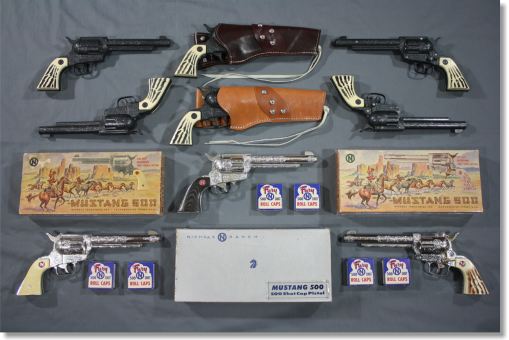 The top shows blued Mustang 500s with a couple of leather holsters from