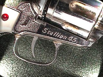 also see the red ruby jewel. Many guns that you might find laying around have lost these jewels, but you can actually buy replacements, as people are making reproduction parts. Notice the little cowboy boot "southwest" of the word, "NICHOLS." Some Pasadena 45's have notches around the rear end of the cylinder. Many thanks to Paul M. Bouder for this photo. |