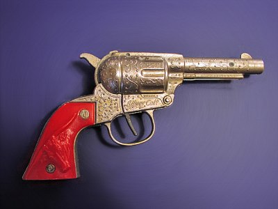 Cap Gun are actually becoming quite scarce. You can't really read it, but it says, "PASADENA TEXAS U.S.A." under the barrel on the bullet ejector. |