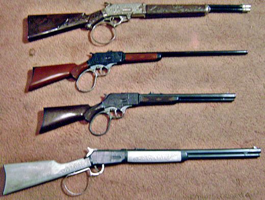 Roundup Rifle, Red River Pistol (left), Westerner Pistol and a Leslie-Henry
