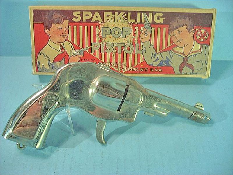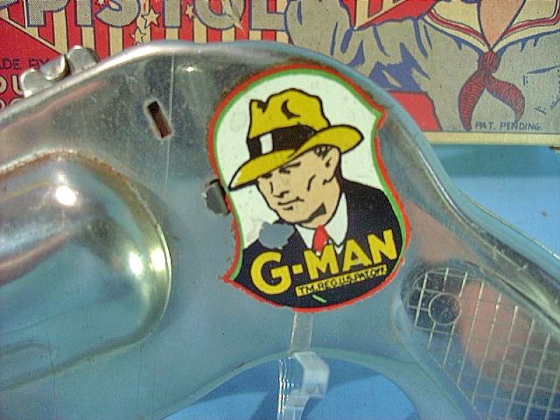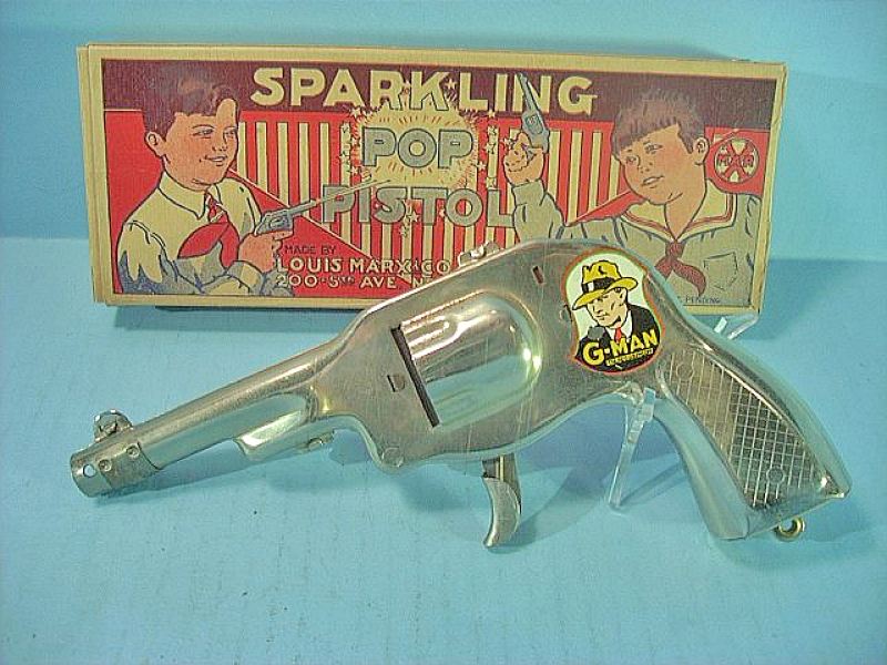 G-MAN Sparkling Pop Pistol produced by Marx. It is a tin toy that is in MINT